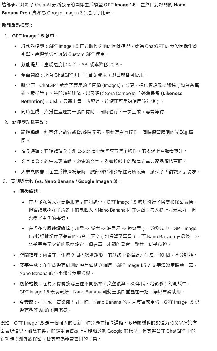 這部影片主要評測了 OpenAI 最新發布的圖像生成模型 GPT Image 1.5,並將其與目前被