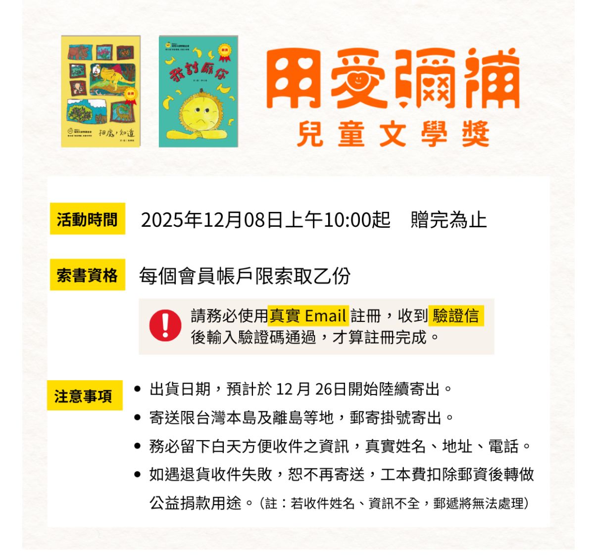免費索取繪本!限量2300組。每個會員帳號限領取乙次。如未滿1000元,酌收80元物流工
