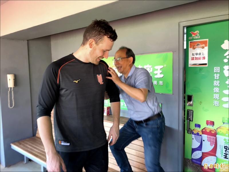 布雷克(左)身高超過200公分,統一獅領隊蘇泰安決定站上椅子,縮短合照時的視覺差