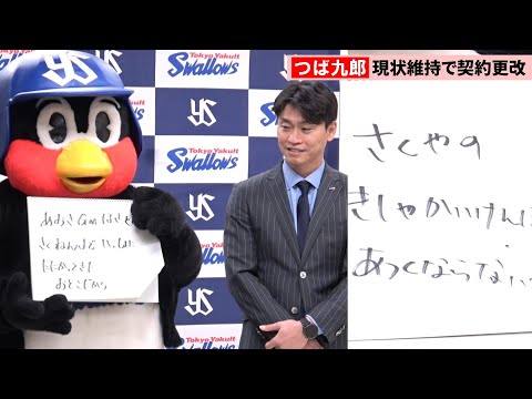 養樂多燕子隊的吉祥物燕九郎今(28)日在明治神宮球場與球團進行續約的
