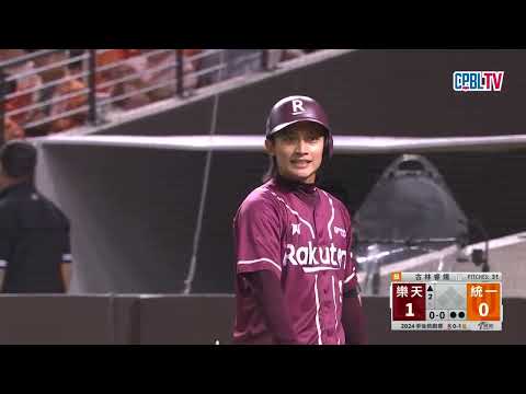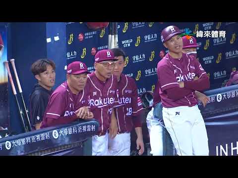 季後挑戰賽首戰在台北大巨蛋進行,2局上樂天桃猿隊的朱育賢敲一壘安打後,林智平擊出