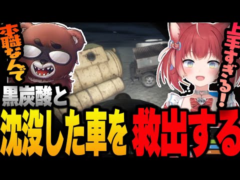 かるび不小心把車子開到水裡,黑炭酸開潛水艇把車子撞出來。