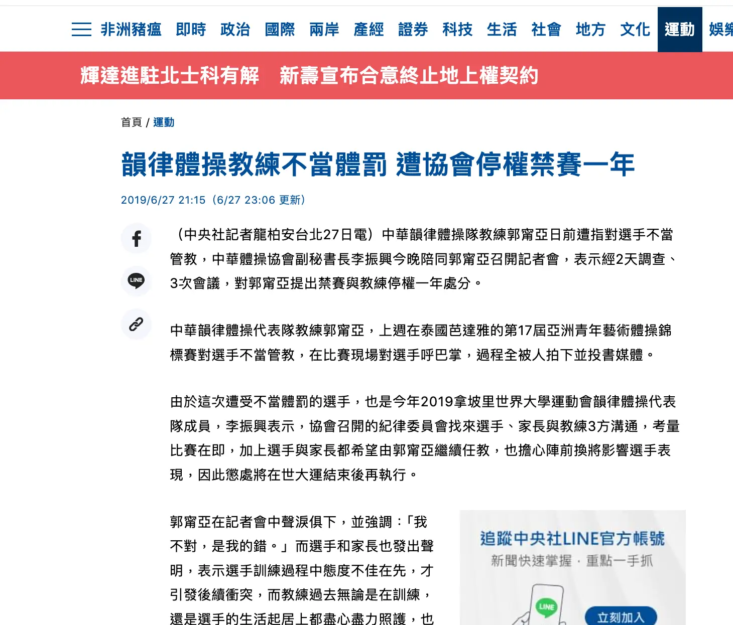 最近體操教練林育信批評體操協會一團亂 登上今天各大新聞