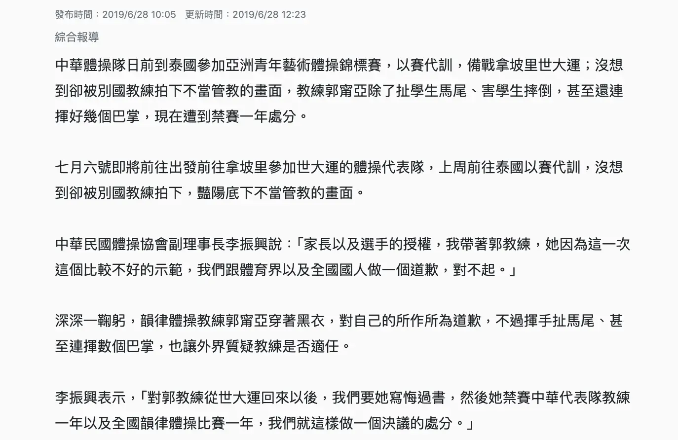 想到卻被別國教練拍下不當管教的畫面,教練郭甯亞除了扯學生馬尾、害學生摔倒,甚
