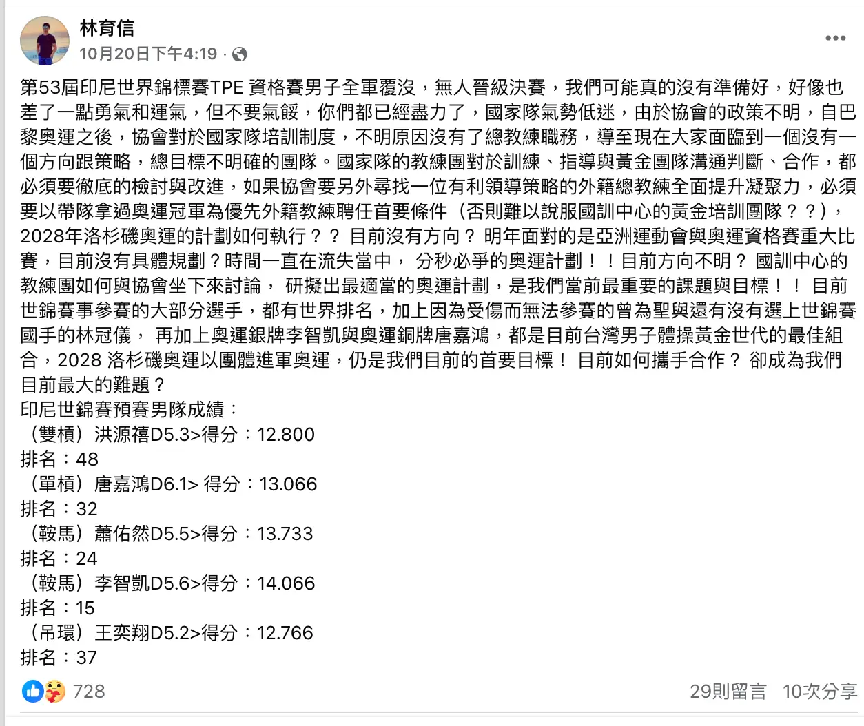 ....國家隊氣勢低迷,由於協會的政策不明,自巴黎奧運之後,協會對於國家隊培訓制度