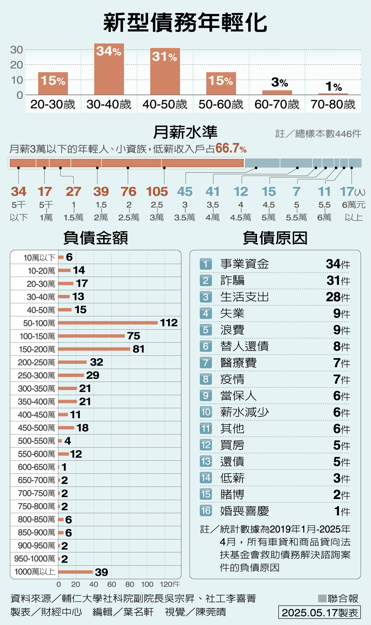 型債務」,四十至六十歲者占比大約七成,但新型債務在年紀的分布上則是顛倒過來,廿