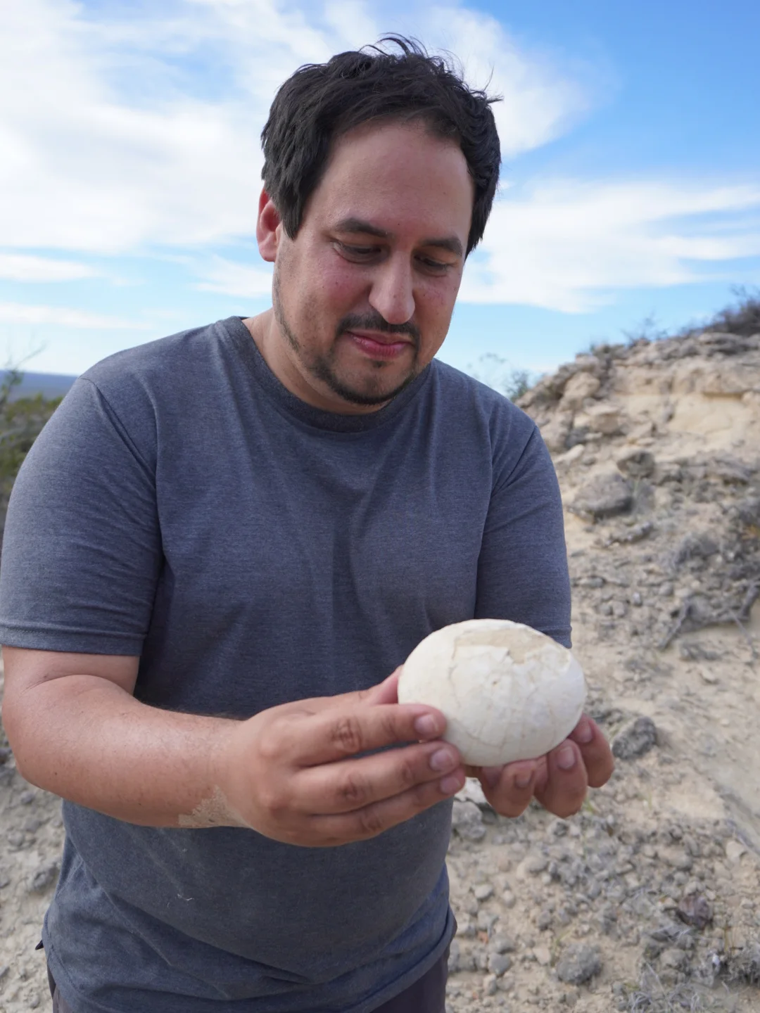阿格諾林手持恐龍蛋仔細端詳。(圖/翻攝自IG@paleocueva.lacev)