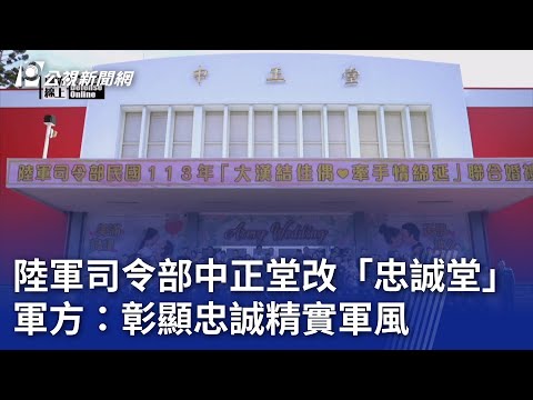 陸軍司令部中正堂改「忠誠堂」軍方:彰顯忠誠精實軍風 | 公視新聞網 PNN 從昨(25)日起,陸軍正式展開為期7天6夜的「陸勝1號操演」,透過實兵對抗演練,驗證戰備訓練成效,規模相較以往升級。而陸軍司令部所在的桃園龍潭大漢營區也有新改變,大禮堂「中正堂」更名為「忠誠堂」,被質疑是配合轉型正義政策推動「去蔣化」。不過陸軍司令部澄清,是考量營區內沒有以陸軍軍風「忠誠精實」命名的 ...