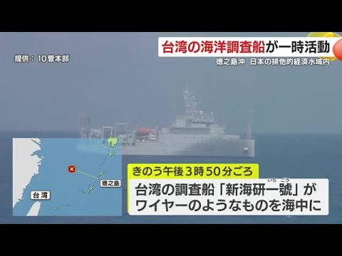第10管区海上保安本部(鹿児島)は4日深夜、鹿児島県・徳之島から西北西に約335キロ離れた日本の排他的経済水域(EEZ)内で同日午後、台湾の海洋調査船がワイヤのようなものを海中に下ろしているのを確認したと発表した。海保が中止を要求。調査船… ...