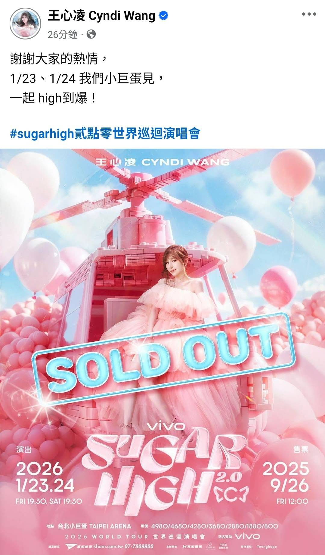 王心凌明年1月23、24日將在台北小巨蛋開舉辦「2026王心凌vivo Sugar High 2.0 台北
