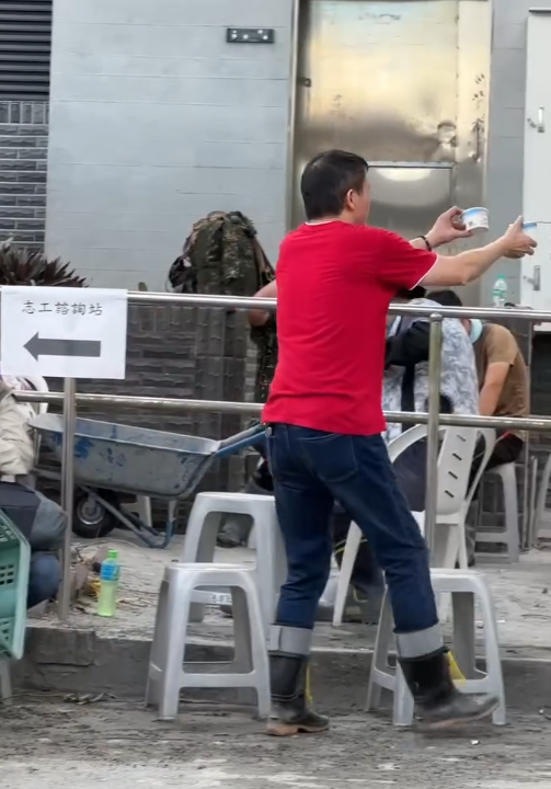 ,一邊發放物資的同時也不忘與現場的其他志工溝通。畫面曝光後,立刻吸引大批網友朝