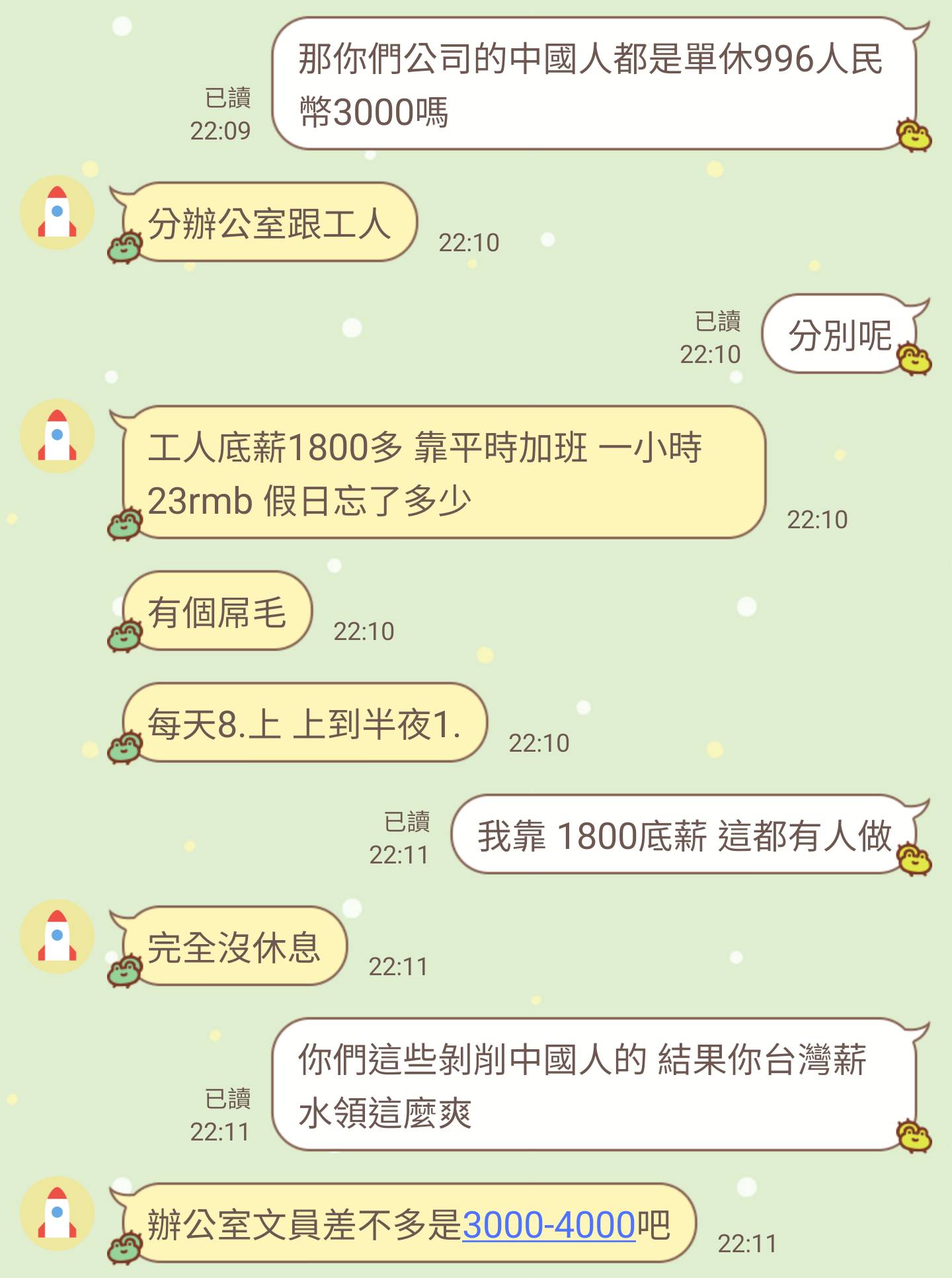 → gary861226: 你真的是台灣人嗎?台灣要找單休工作比雙休還難欸,不像中國滿大街日工時12小的服務生24F 101.12.115.106 台灣 10/08 14:29