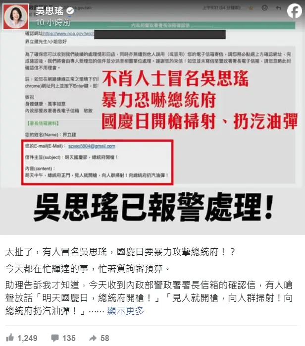 冒名「吳思瑤」宣告國慶日總統府開槍 本尊氣炸報警