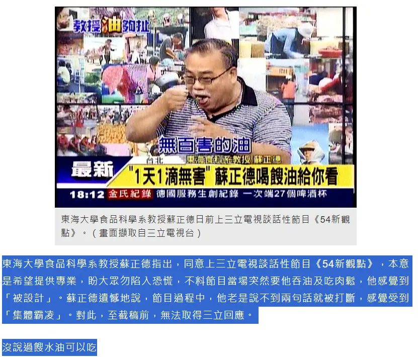 東海大學食品科學系教授蘇正德指出,同意上三立電視談話性節目《54新觀點》,本意是希望提供專業,盼大眾勿陷入恐慌,不料節目當場突然要他吞油及吃肉鬆,他感覺到「被設計」。蘇正德遺憾地說,節目過程中,他老是說不到兩句話就被打斷,感覺受到「集體霸凌」。對此,至截稿前,無法取得三立回應。沒說過餿水油可以吃 ...