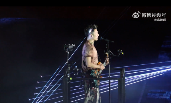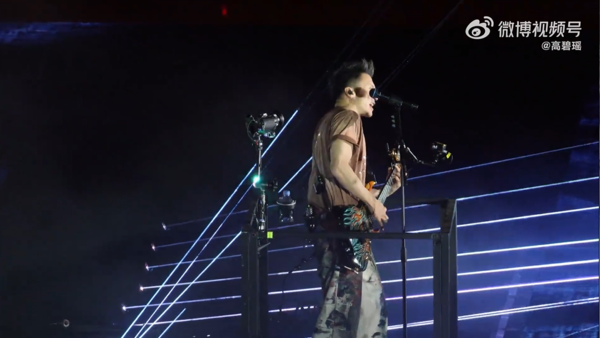 在流出的影片中,謝霆鋒正彈著吉他演唱〈潛龍勿用〉,突然舞台的雷射光束直接射中他