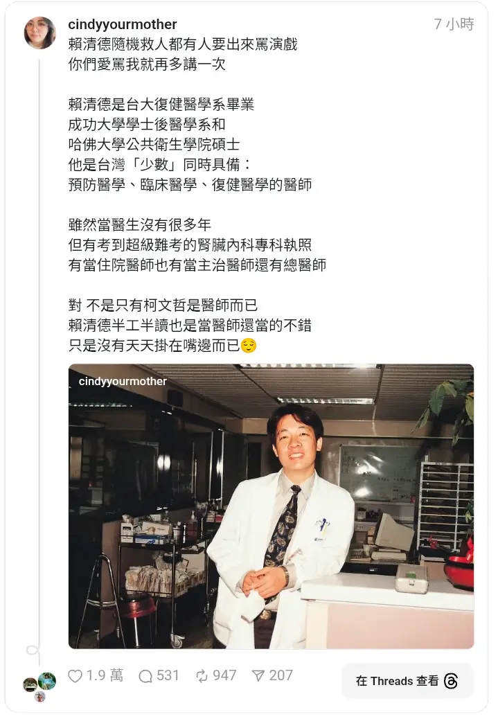 : 網友解釋賴清德雖然當醫生沒有很多年,但有考到超級難考的腎臟內科專科執照、有當