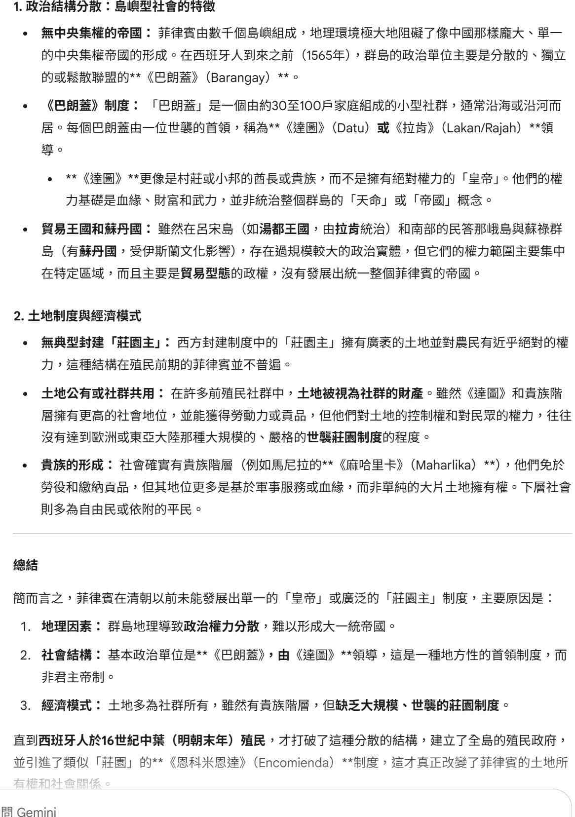 : 問ai菲律賓以前怎沒發展出皇帝或莊園主?