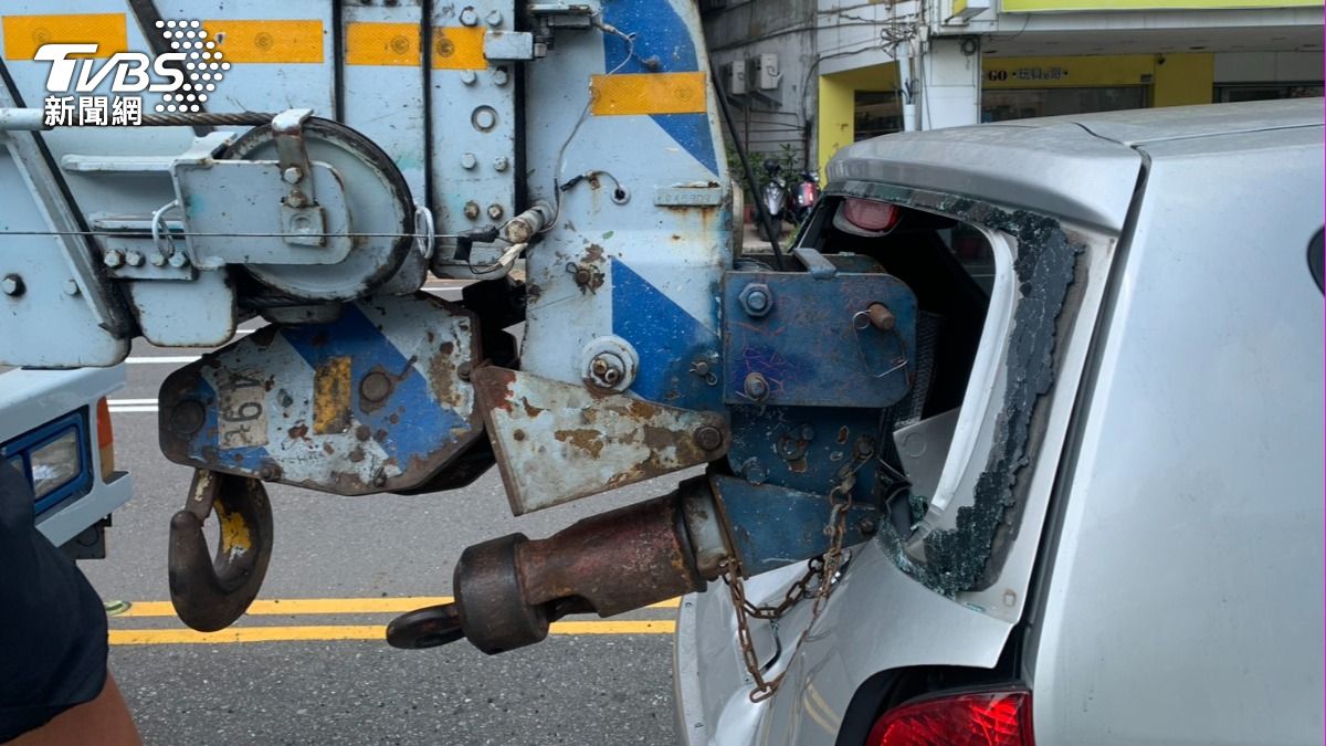 吊臂插進後擋風玻璃。(圖/TVBS)