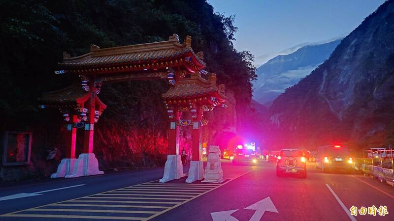 立霧溪的燕子口崩塌形成堰塞湖,溪水傍晚6點後已超過公路高度,太魯閣牌樓旁觀景台