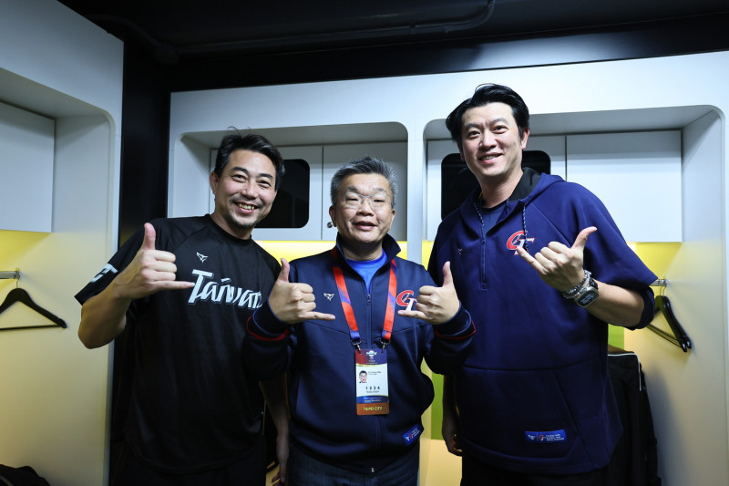 《冠軍之路》教練王建民、中華職棒會長蔡其昌、教練林岳平開心合影。(牽猴子提供)