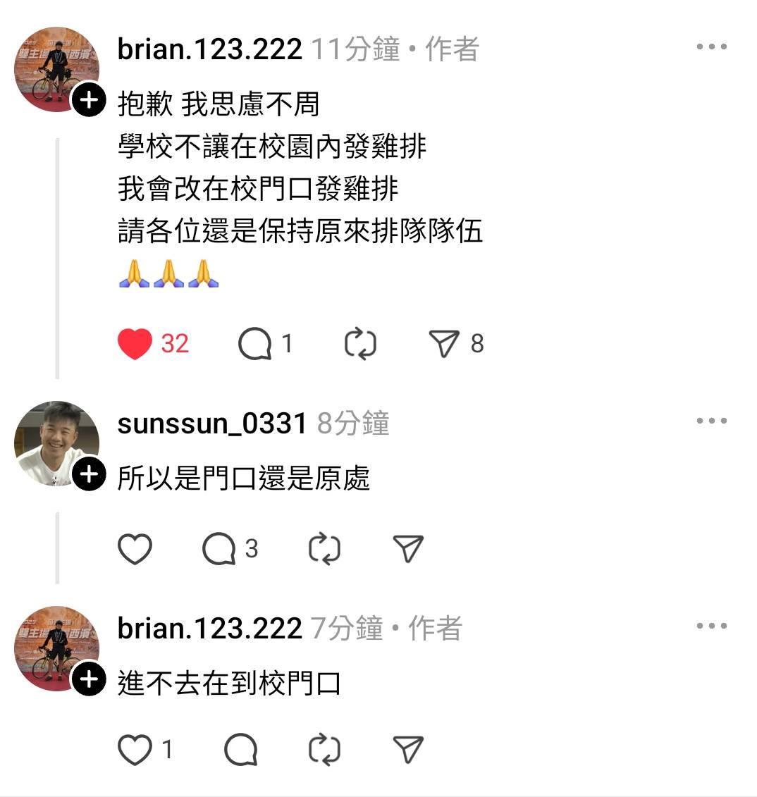 作者 cl3bp6 (來自97號世界)標題 [新聞] 自稱台大大氣放鳥雞排「電機系今天送」時間 Mon Nov 17 14:53:05 2025