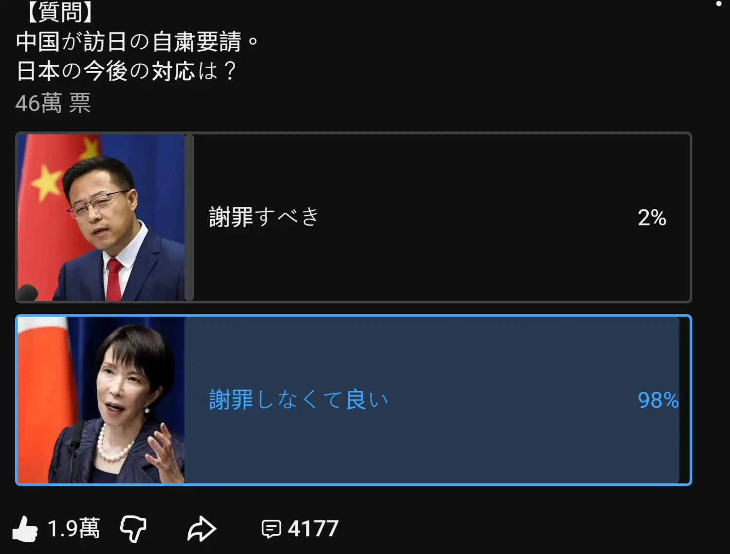 [問卦] 98%認為高市不用道歉(46萬人投票)