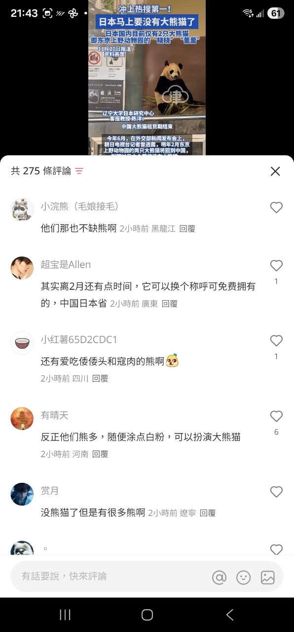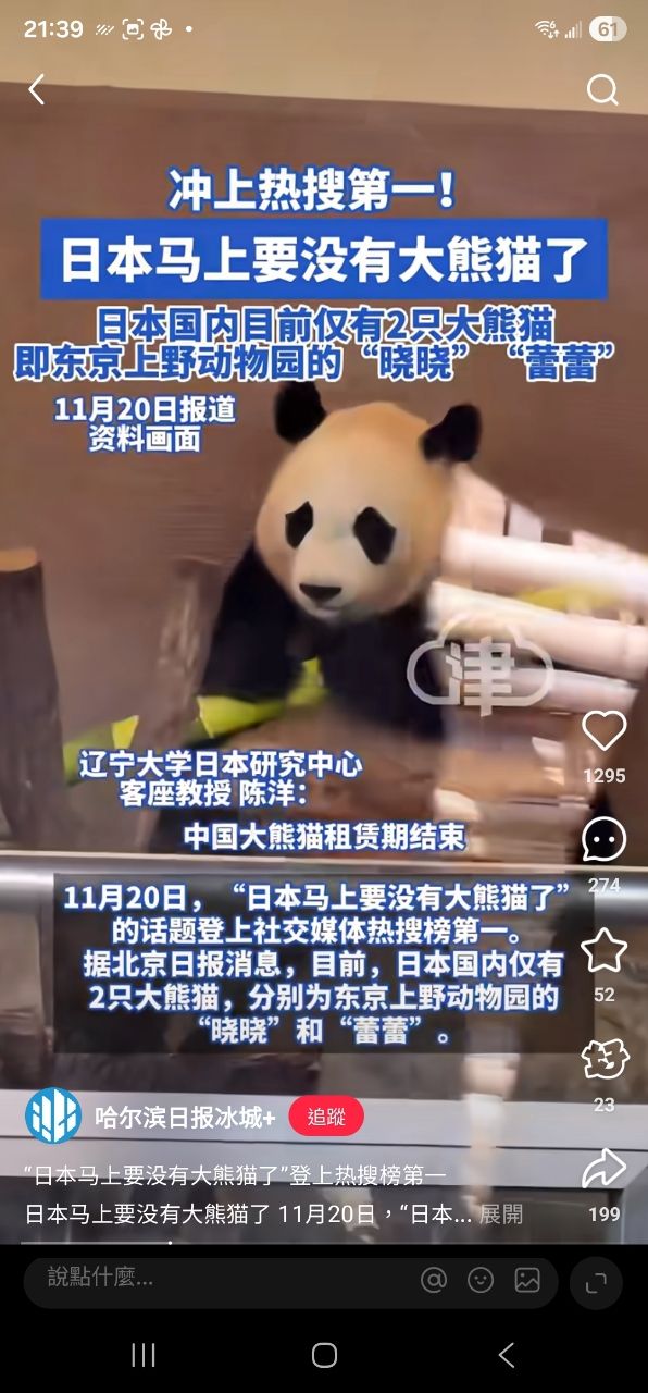 作者 callhek (貓貓仲介商)標題 [問卦] 熱搜第一,日本要沒有大熊貓了時間 Thu Nov 20 21:45:46 2025
