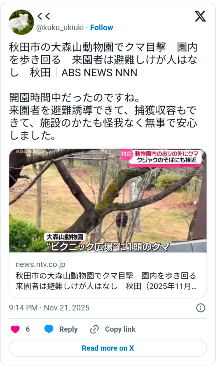 作者 hppoyxyzz (EBHW)標題 [新聞] 黑熊逃出圍欄!秋田動物園內「逛大街」畫時間 Sat Nov 22 14:23:04 2025