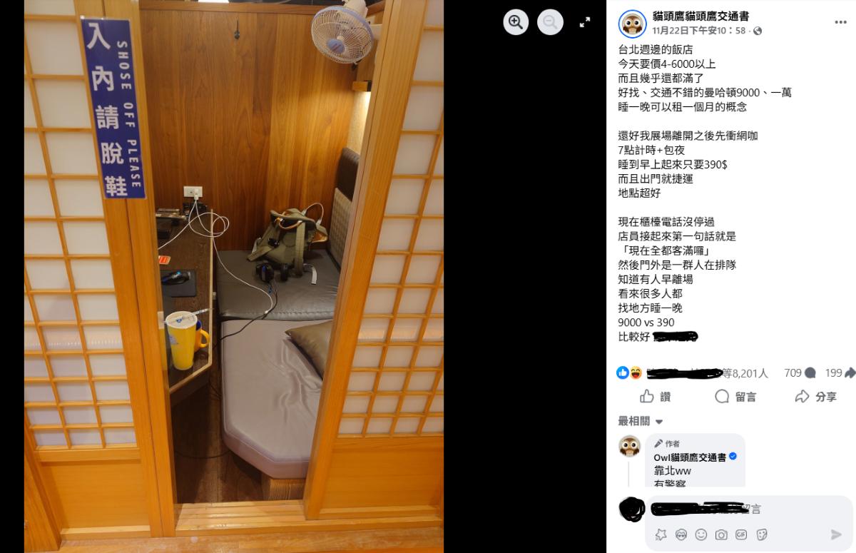 的粉專「Owl貓頭鷹交通書」就發文分享,他上週末在台北只花了390元就解決住宿問題,