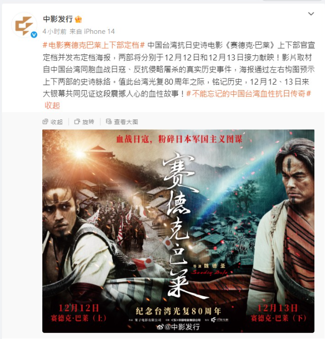 《賽德克巴萊》定檔12月12日上映《太陽旗》,12月13日上映《彩虹橋》。
