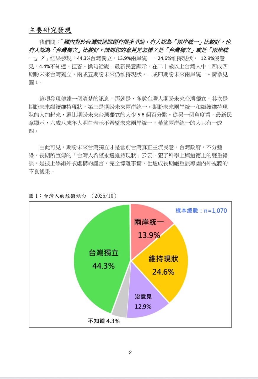 44.3%支持台灣獨立,大於支持維持現狀加上支持統一,是不是看起來台獨就是主流民意