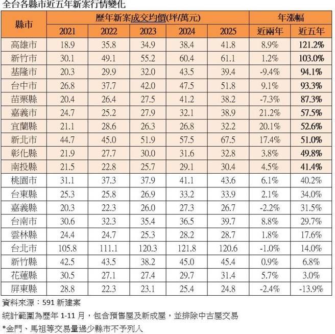 591新建案指出,過去五年來全台本島19個縣市有8個縣市房價漲幅超過五成,高雄市及新
