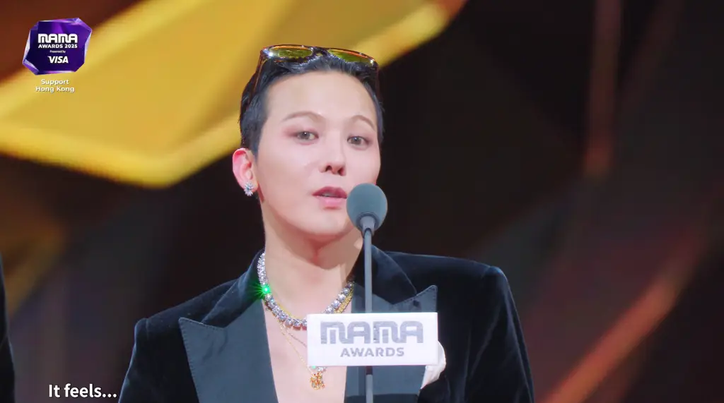 GD從周潤發手中接過獎座後表示:「能從我永遠的偶像手中接下這個獎,感到無比榮幸。」也感謝去年透過MAMA回歸,「今年又有著不同於往年的感受。」還一度哽咽無法繼續說下去,之後強忍淚水說:「雖然今天是個值得開心的日子,但也是一個令人傷感的日子,悲喜交集,各種情緒交錯。」還不忘提及明年就是所屬團體BIGBANG出道20週年了,「希望明年不再孤單,能和成員們一起來參加這個派對。」