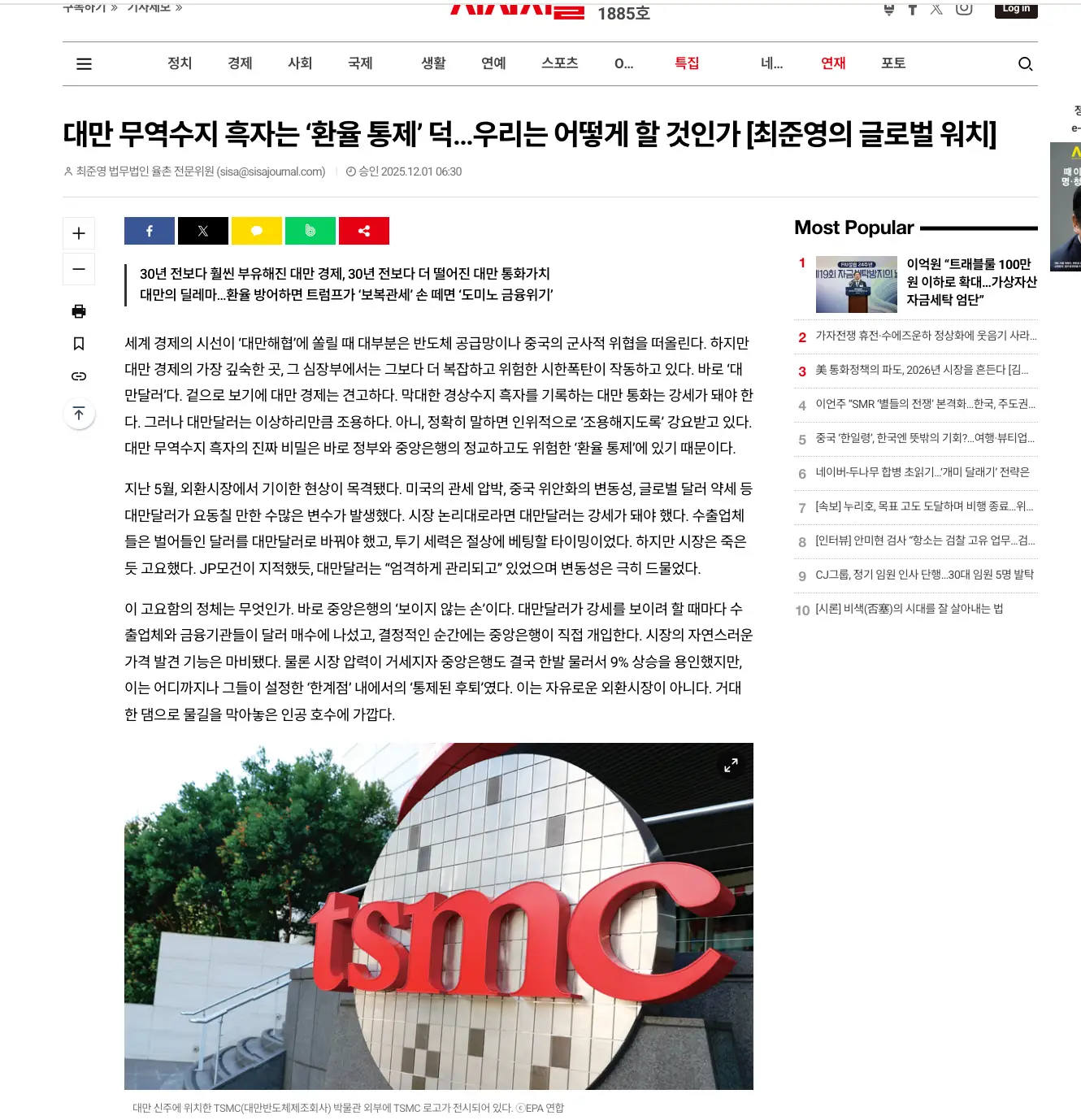 今日這位韓國財經博士 崔俊英博士在韓媒《時事雜誌》投稿談台灣的經濟和匯差