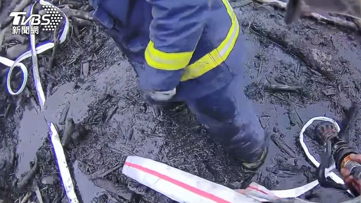 火災現場滿目瘡痍,變成一灘灘爛泥,義消兩條腿卡在泥濘中,要費很大力氣才能脫困。