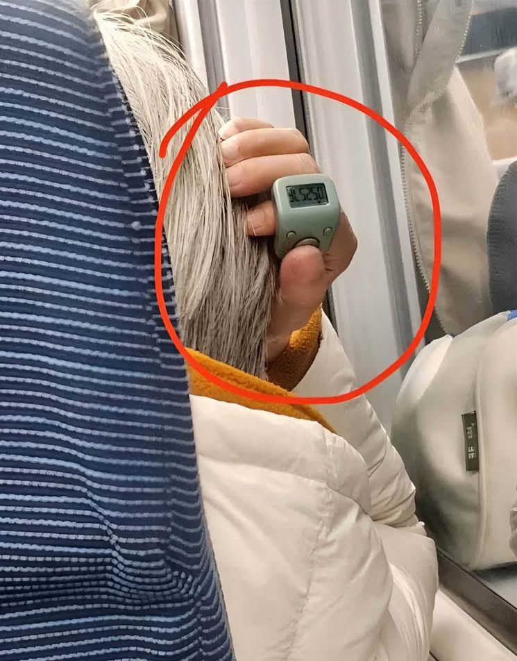旁邊坐個老人,手上拿個小東西一直按一直按