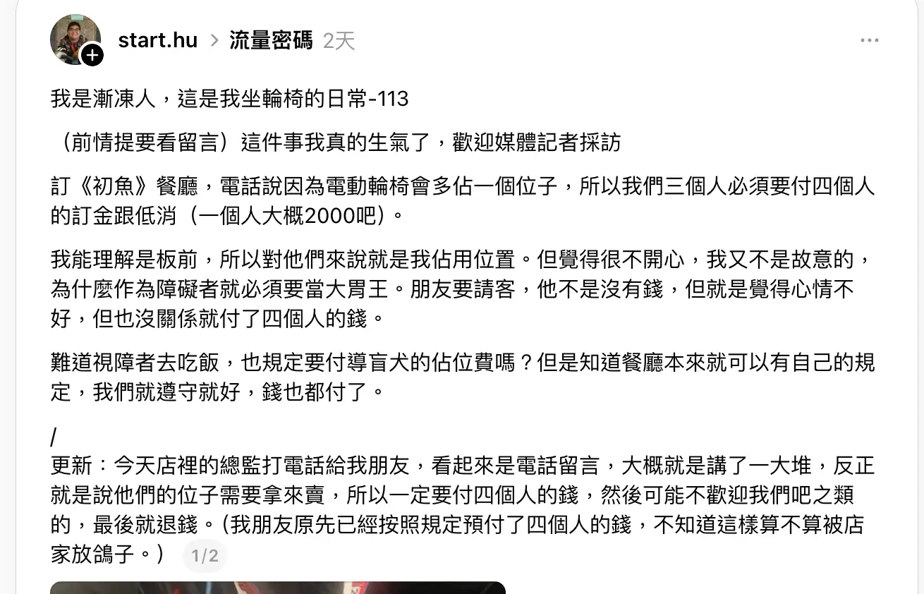 如果店家在漸凍人上門之前說 因為你的輪椅會佔位 所以要多付一人費用