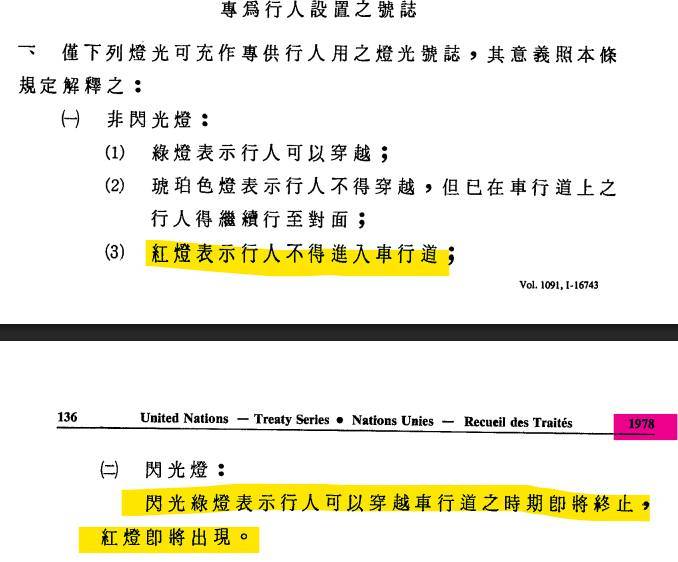 1978聯合國是這樣寫的,「紅燈表示行人不得進入車行道;」