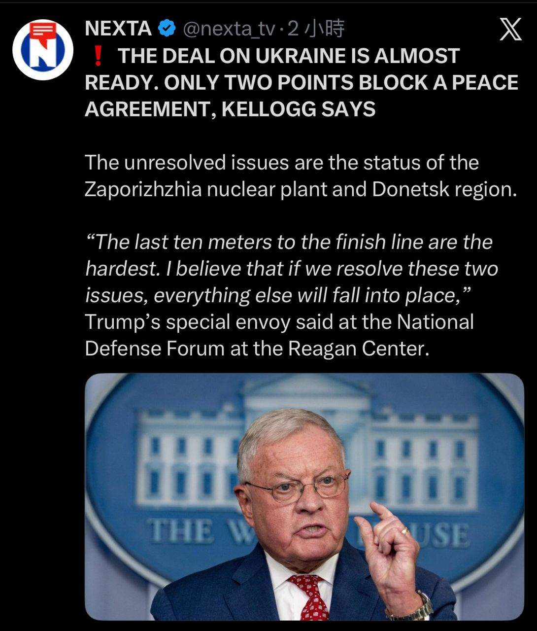 這兩天烏克蘭與美國再佛州協商,美國俄烏特使Kellogg到底時間6日在加州雷根論壇上表