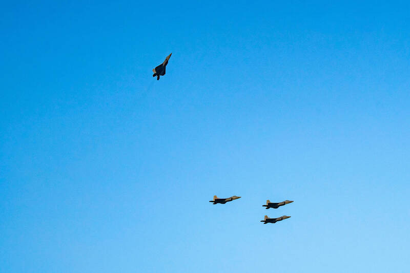 戰機以「缺席隊形」飛越上空,其中一架F-22「猛禽」戰機脫離編隊,象徵罹難者。(美