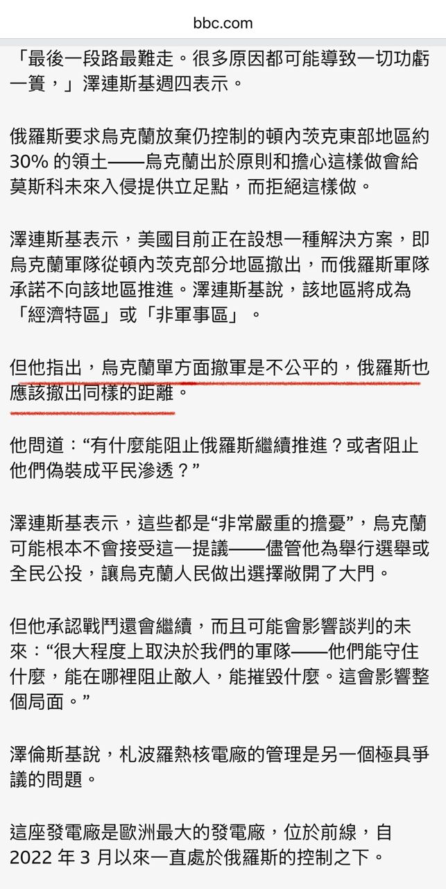 其實俄羅斯已經半同意撤出蘇梅、哈爾科夫跟第聶伯羅的佔領區,澤倫斯基應該是要俄國