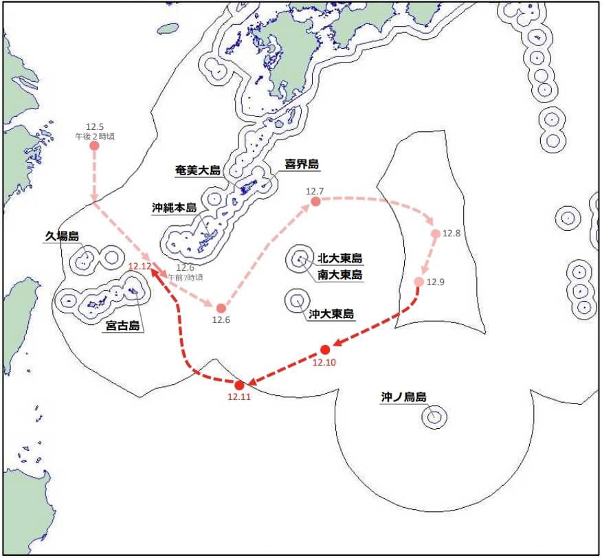 經大東群島以南往東海的方向前進。