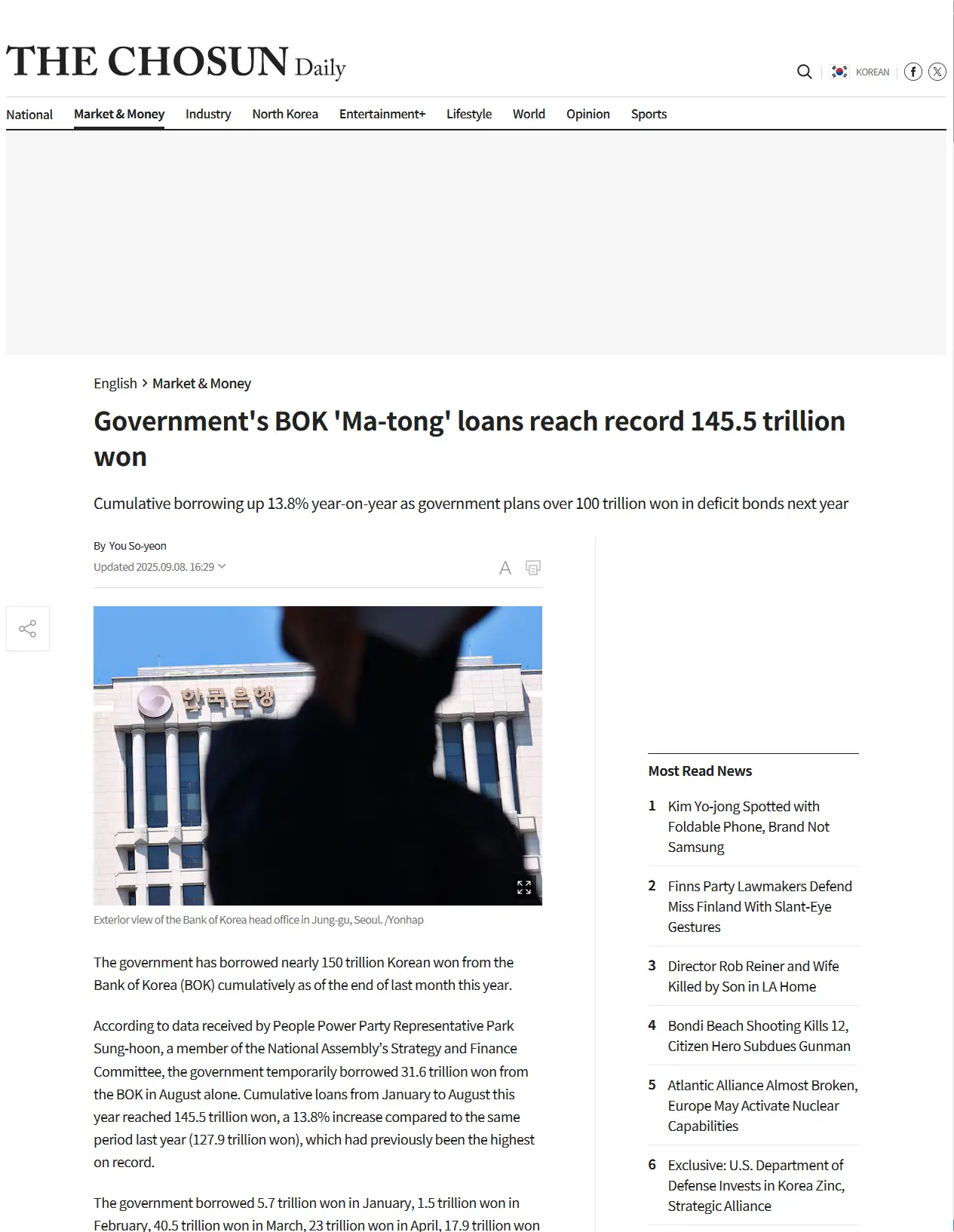 Governments BOK Ma-tong loans reach record 145.5 trillion won Cumulative borrowing up 13.8% year-on-year as government plans over 100 trillion won in ...