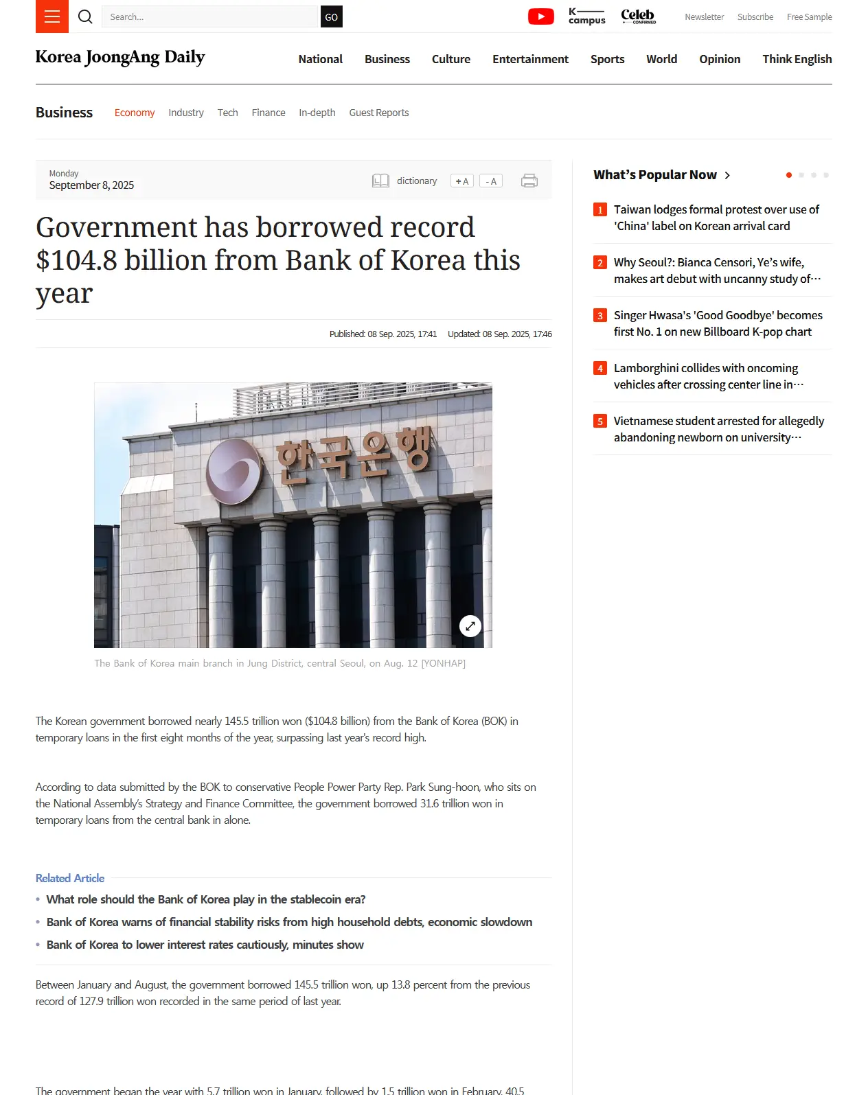 Government has borrowed record $104.8 billion from Bank of Korea this year