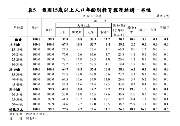 113年我國15歲以上人口年齡別教育程度結構-男性統計