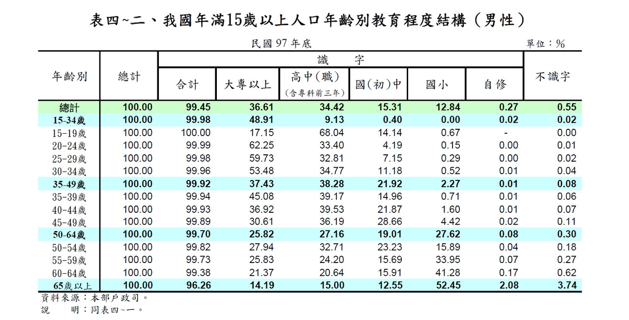 台灣男性中 高中(含專科前三年)以下學歷