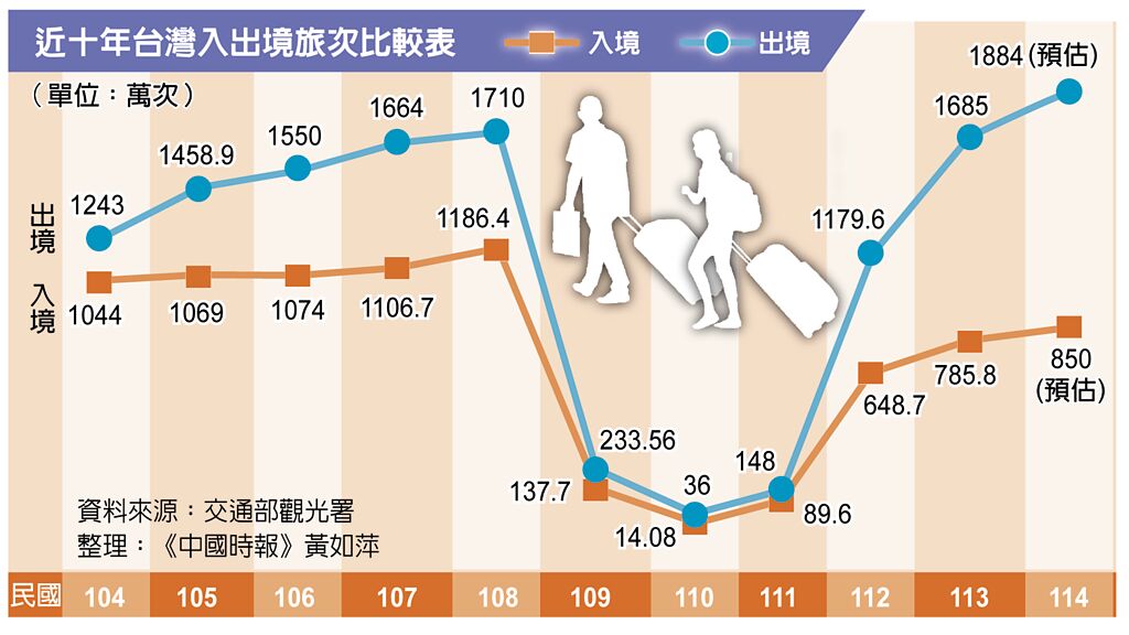岸觀光旅次落差拉大,114年預估相差近380萬人次,以113年台灣赴陸旅遊平均花費4萬元