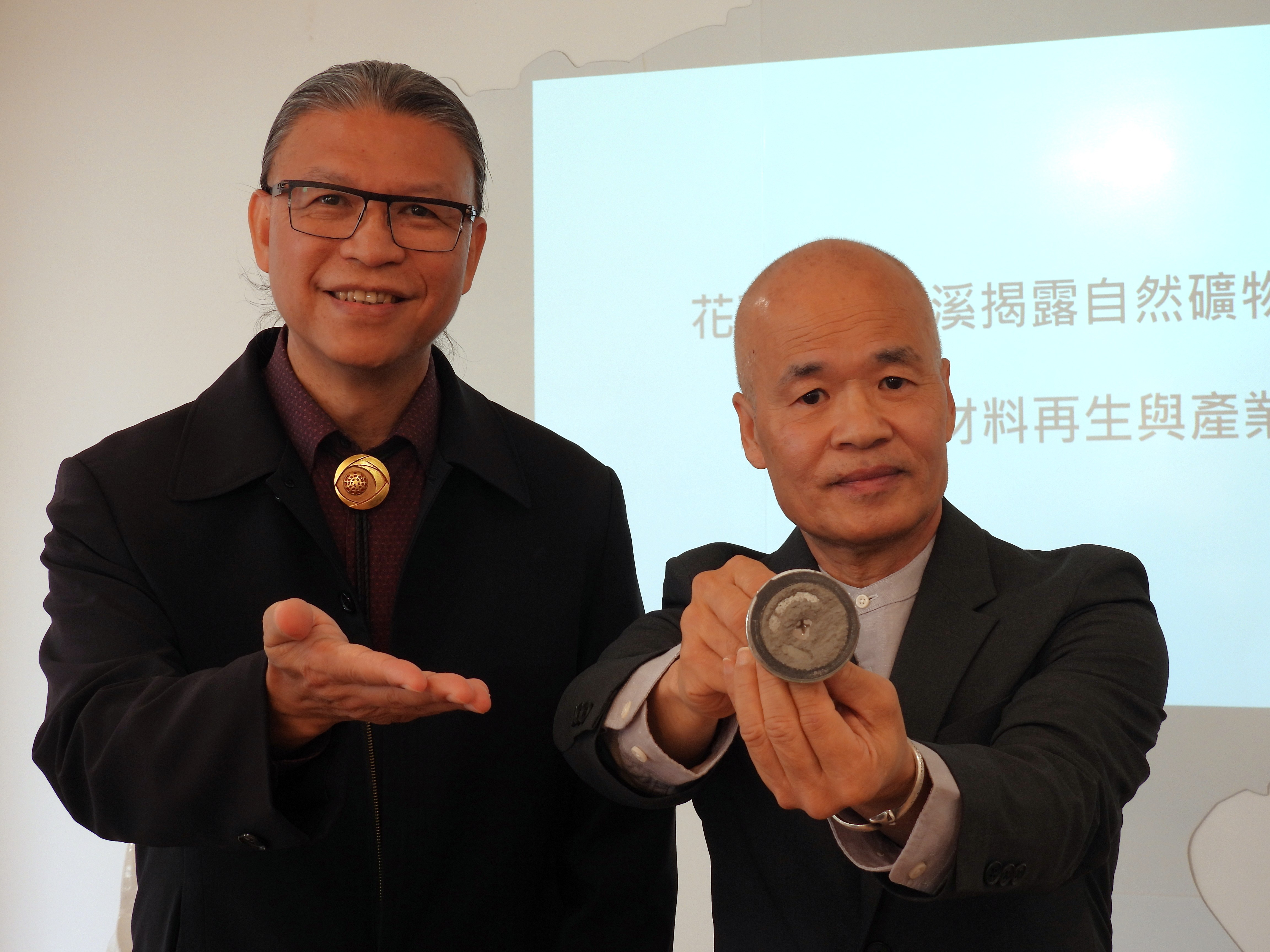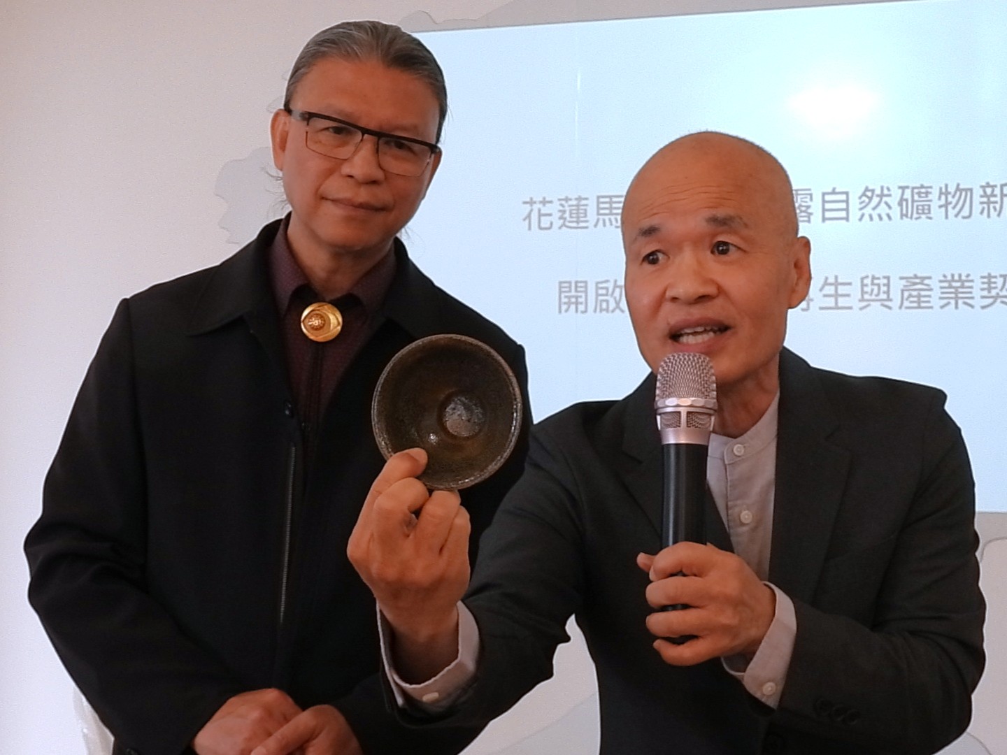 陶藝家陳金旺(右)將馬太鞍災後淤泥樣本送交工藝中心分析,發現蘊含順磁性的天然礦
