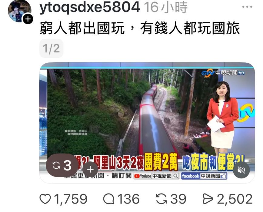 → snow3804: 就是有你這種人在支持垃圾國旅2F 111.71.212.249 台灣 12/16 13:33