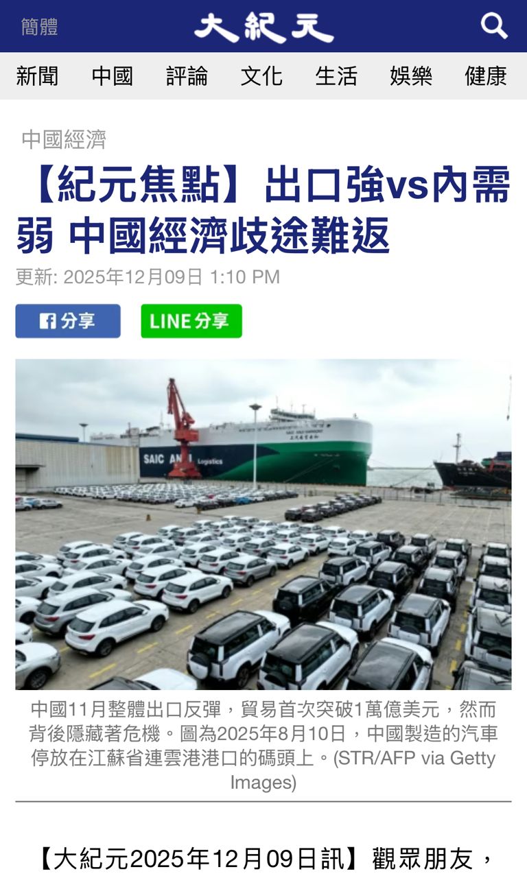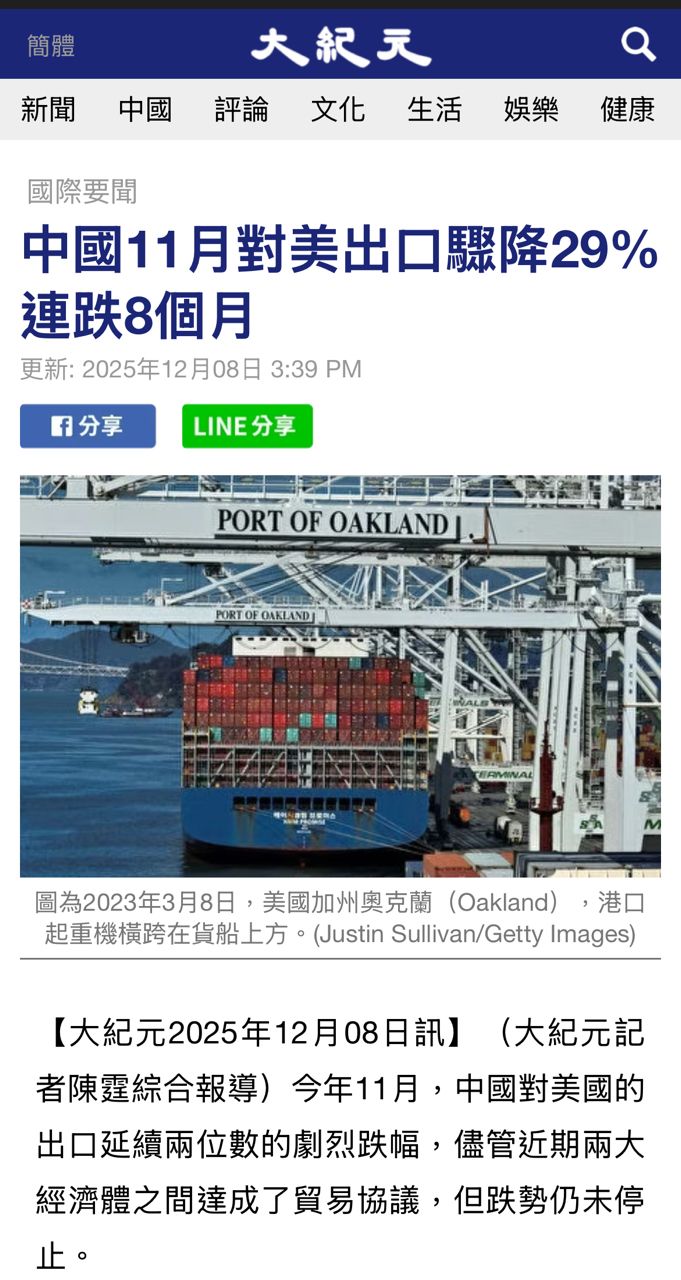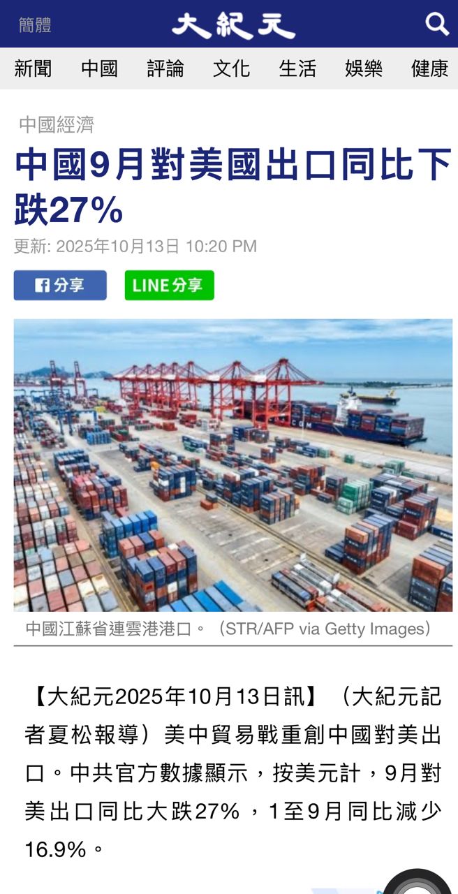 好比10月才告訴你,中國9出口到美國大幅下降了,經濟不行了